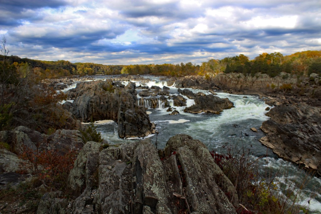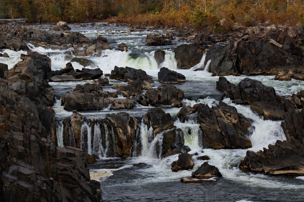 The park is at a point where the Potomac River funnels into a narrow gorge and cascades over jagged and steep rocks.